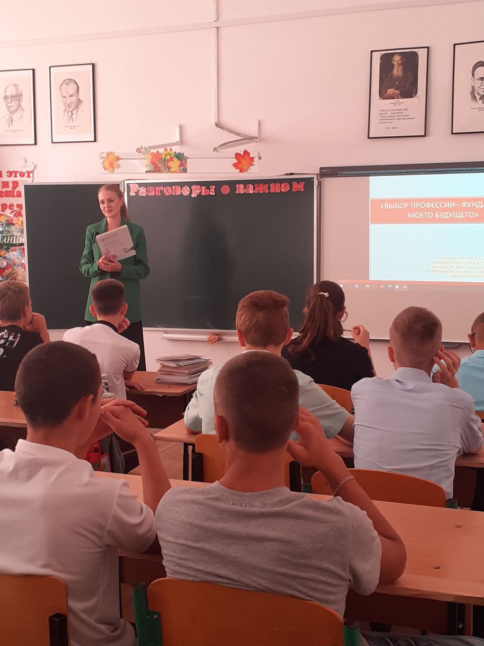 6 сентября 2023 года специалист ГКУ КК Центра занятости населения Новопокровского района провела урок по профессиональному ориентированию для учащихся 8-9 классов.